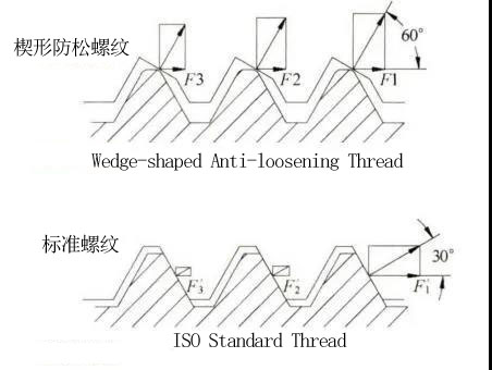• The unique 30° wedge-shaped inclined surface structure converts axial loosening force into radial locking force. Its normal pressure is twice that of ordinary threads, and the anti-loosening friction is increased by more than 3 times.